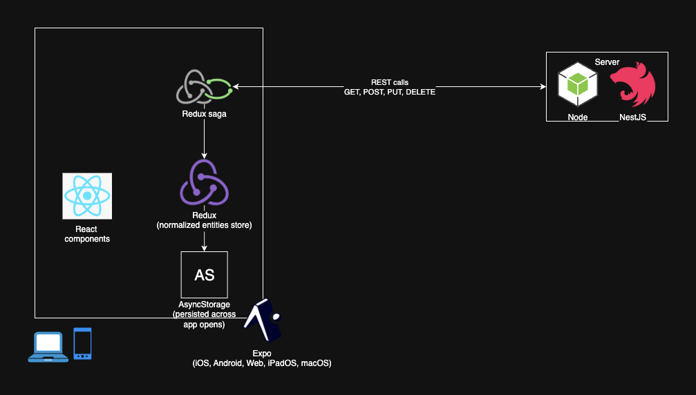 Below is a simplified diagram showing how data is exchanged between the client app and the server, through HTTP calls.
